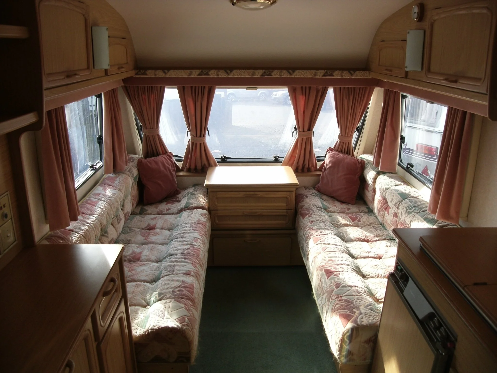 This caravan has an extremely practical layout. At the front, the roomy lounge area has two single beds or a large double utilising a pull out slat system mounted under the chest of drawers, which has a fold-out table. Fully funtional.